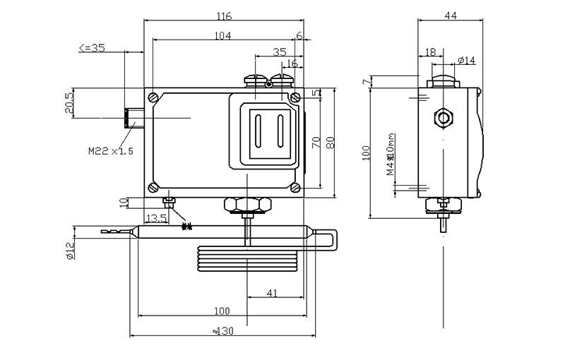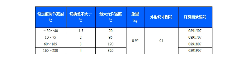 541/7TK溫度控制器采用帶毛細(xì)管溫包式傳感器,可用于流動的中性氣體和液體介質(zhì),如果介質(zhì)為腐蝕性,安裝時(shí)可選用不銹鋼溫包保護(hù)套套在銅質(zhì)溫包外(見附件)。541/7TK溫度控制器的設(shè)定值可調(diào),調(diào)節(jié)范圍-30~280℃。